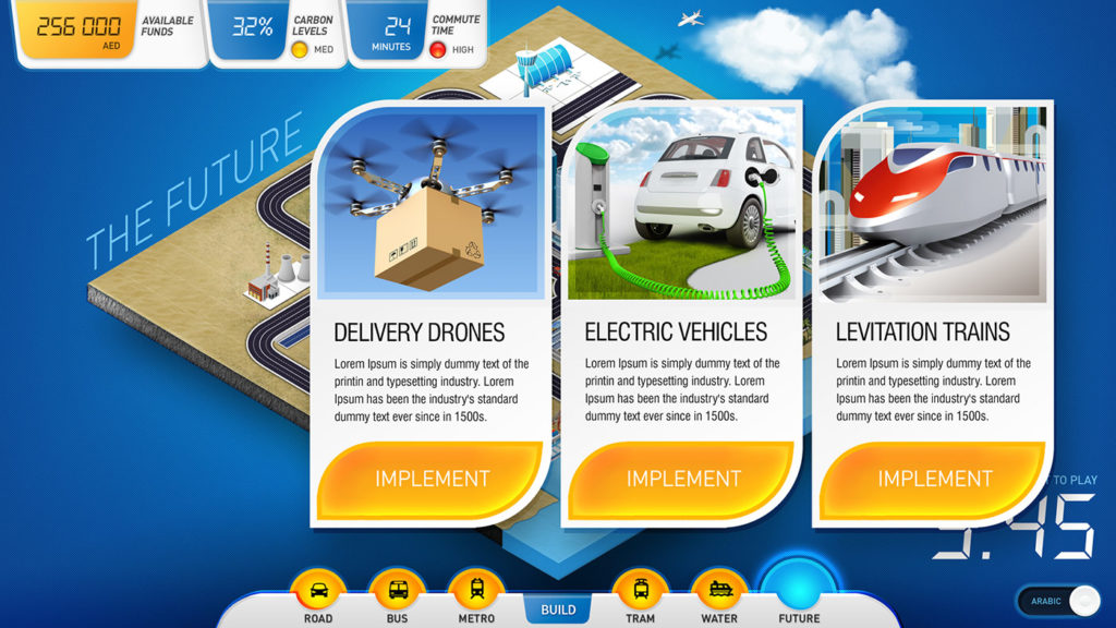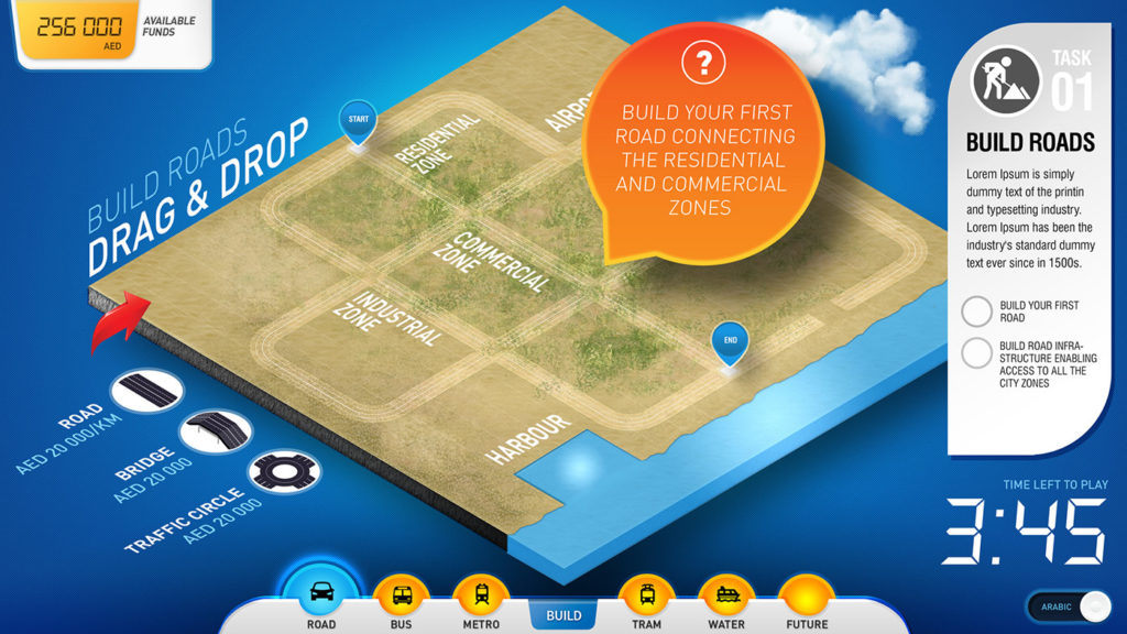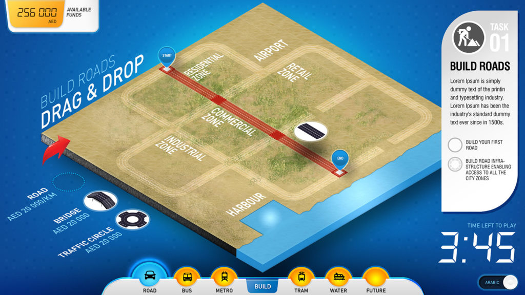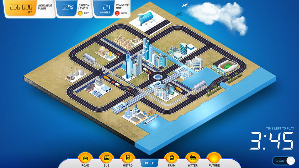 A fun, simple and intuitive touch screen game designed to introduce visitors to the concept of city transport network planning. The bespoke custom designed and developed game is installed at the RTA Visitor Centre in Dubai.